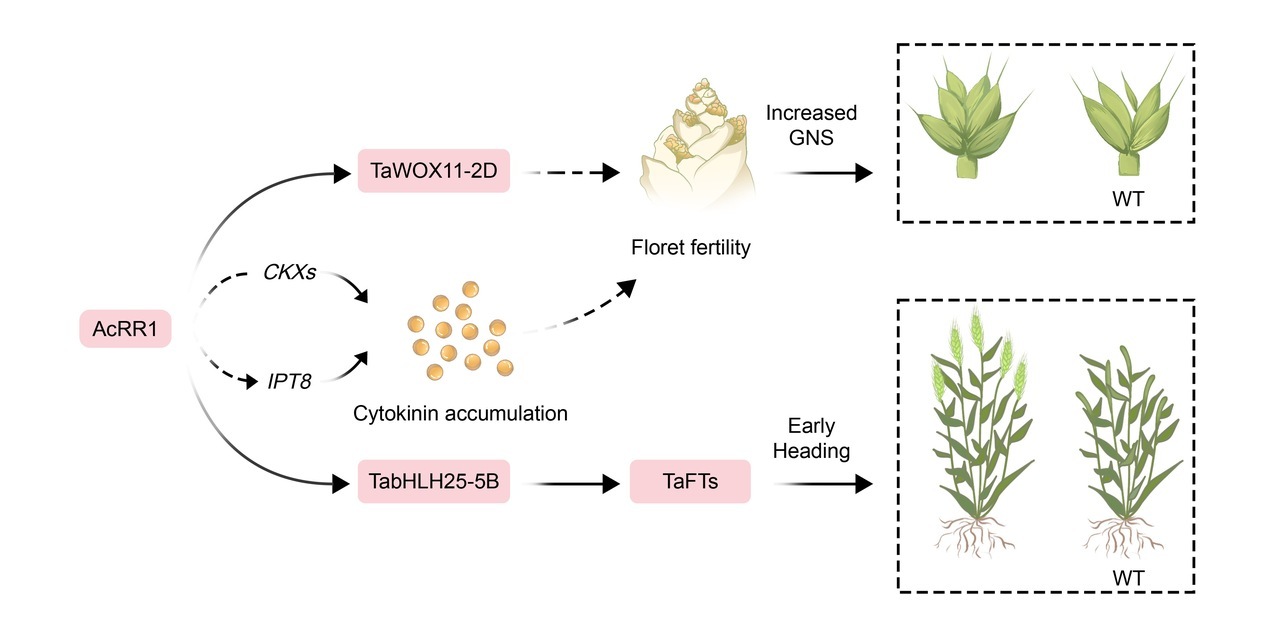 科研团队鉴定到一个冰草穗发育的关键基因AcRR1。在小麦中异源表达该基因可显著增加植株穗粒数,同时对粒重等农艺性状没有任何影响。田间试验显示,相对于对照品种,表达该基因后的小麦产量可提升9.7%-12.3%。进一步研究发现,该基因通过调控小麦小花育性、开花相关基因的表达和幼穗细胞分裂素积累来提高穗粒数、缩短其春化周期、促进早抽穗,进而提高小麦产量和早熟。该研究为通过导入外源基因来提高小麦产量提供了理论基础和新思路。