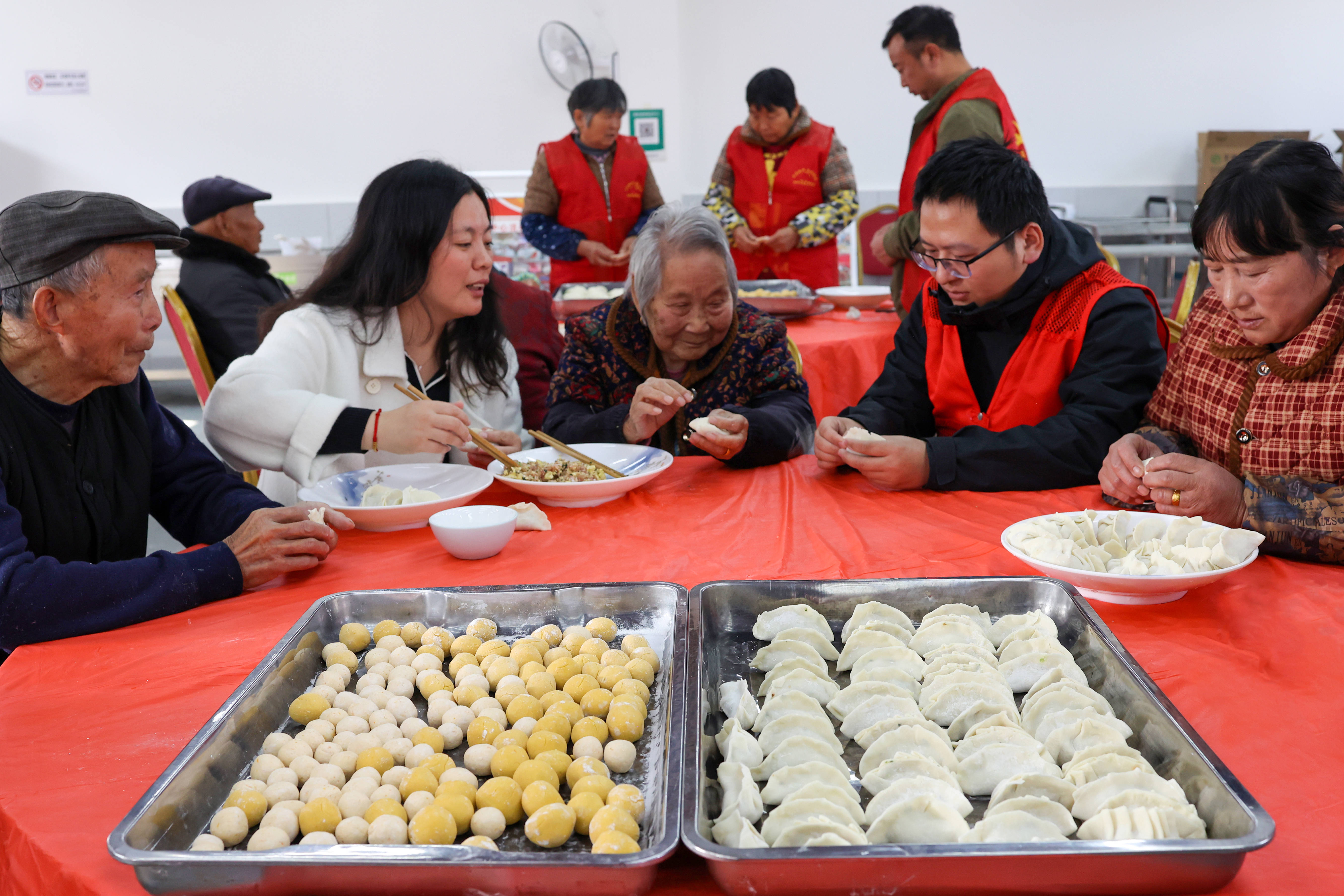 12月18日,在江苏省兴化市临城街道赵何村颐养中心,志愿者和老人们一起包饺子、搓圆子。新华社发(史道智摄)南圆北饺