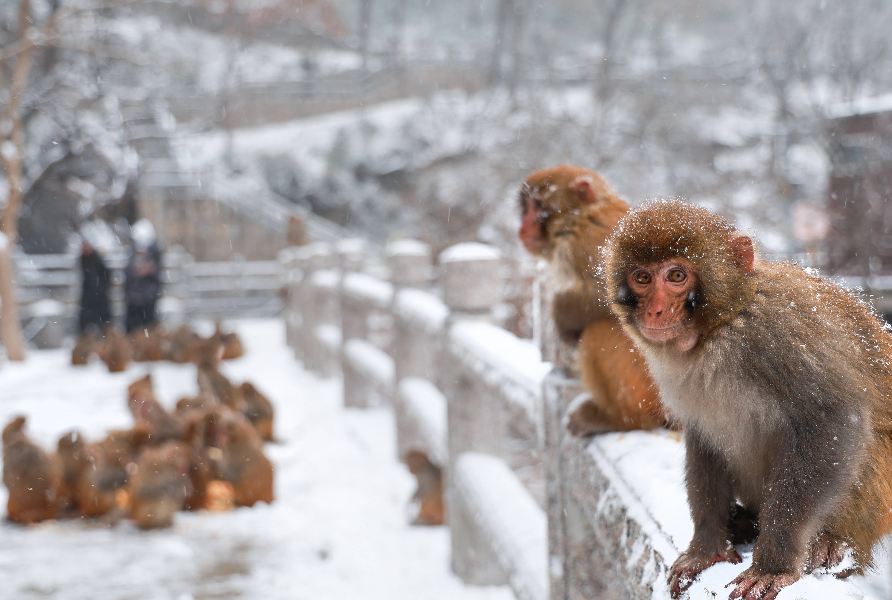 12月13日,一场降雪过后,在江苏省连云港市花果山景区玉皇阁,猕猴在护栏上歇息。 新华社发(王健民摄)冬至虽冷