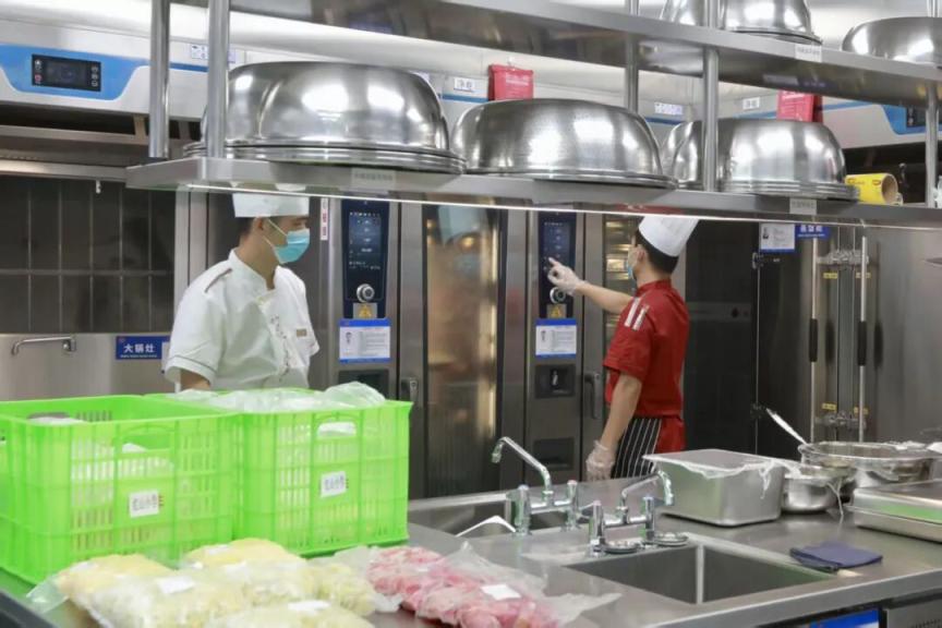 学校的后厨设备同样可圈可点:全自动洗碗流水线集清洗、消毒、烘干功能于一体,智能消毒库采用高温蒸汽+紫外线双重杀菌,保障食品安全;智能炒菜机可以适配200道以上菜谱,提高高峰时段的供餐效率;万能蒸烤箱能精准温控且可远程监控。