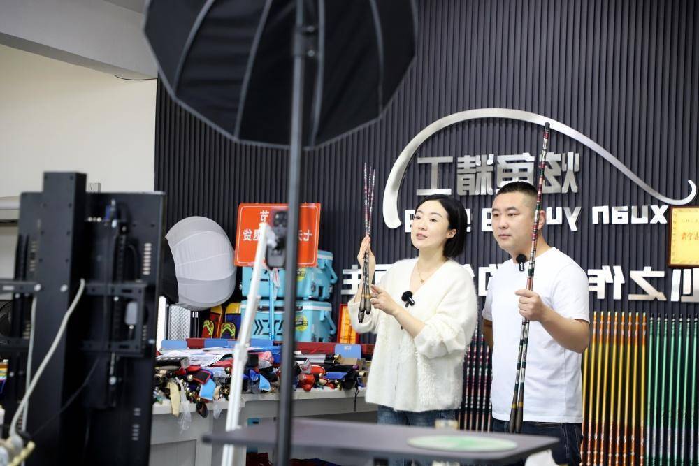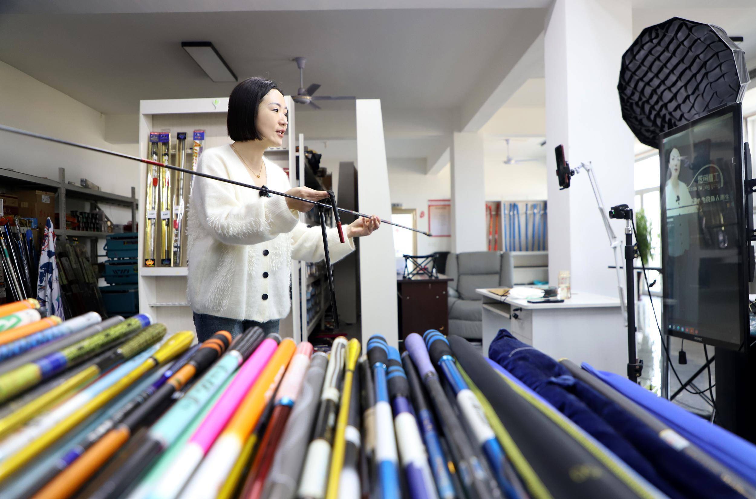 近日,在河北省沧州市肃宁县西乾泊村,村民郭小随正在进行直播。魏志广摄近日,在河北省沧州市肃宁县西乾泊村,村民郭小随正在忙着直播,电商服务中心内村民正在给鱼竿进行打包,并发往全国各地。